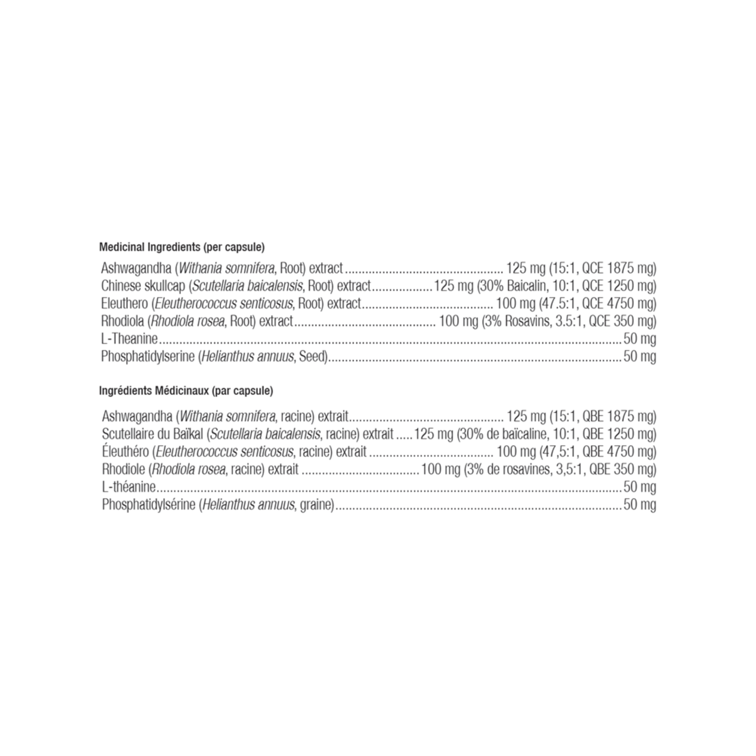 Ashwagandha (Withania somnifera, Root) extract……………………………….125 mg (15:1, QCE 1.875 g) Chinese skullcap (Scutellaria baicalensis, Root) extract..125 mg (30% Baicalin, 10:1, QCE 1.25 g) Eleuthero (Eleutherococcus senticosus, Root) extract …………………………100 mg (47.5:1, QCE: 4.75 g) Rhodiola (Rhodiola rosea, Root) extract…………………………………100 mg (3% Rosavins, 5:1, QCE 0.5 g) L-Theanine…………………………………………………………………………………………………………………………………………………………..50 mg Phosphatidyleserine (Phosphatidylserine-enriched soy lecithin)……………………………………………50 mg