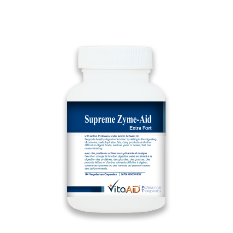 Supreme Zyme-Aid Extra Fort is a comprehensive blend of 11 different enzymes that support healthy digestive function by aiding in the digestion of proteins, carbohydrates, fats, dairy products and other difficult-to-digest foods, such as yams or beans that can cause bloating. This proprietary enzyme blend contains different proteases that enable it to work in different pH zones of the gastrointestinal tract.